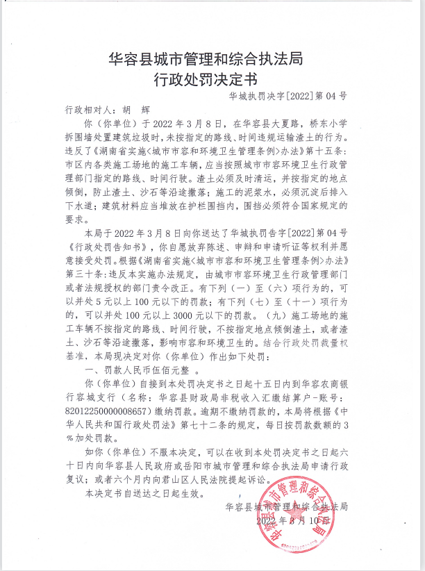华容县大夏路桥东小学折围墙处置建筑垃圾,胡某未按指定的路线、时间违规运输渣土的行政处罚决定公示