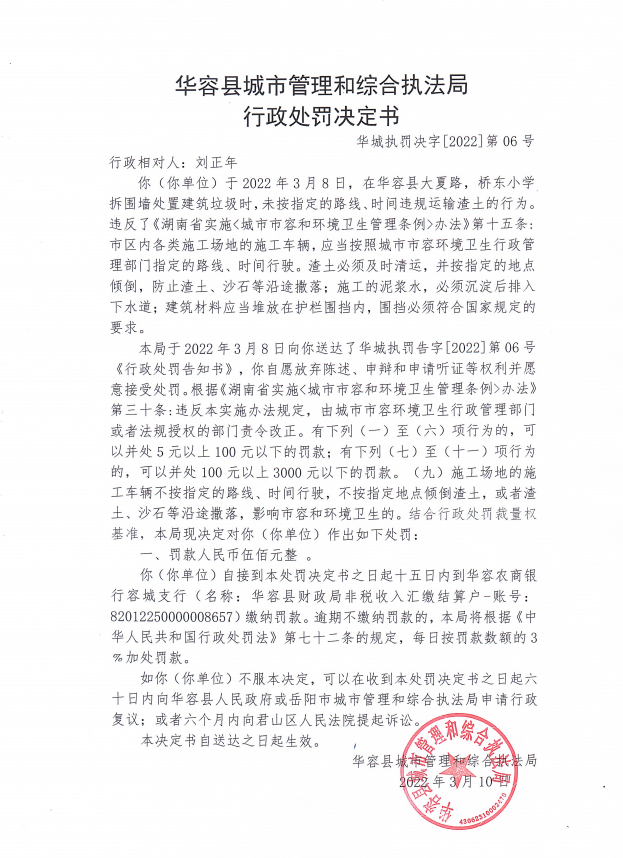 华容县大夏路桥东小学折围墙处置建筑垃圾,刘某未按指定的路线、时间违规运输渣土的行政处罚决定公示