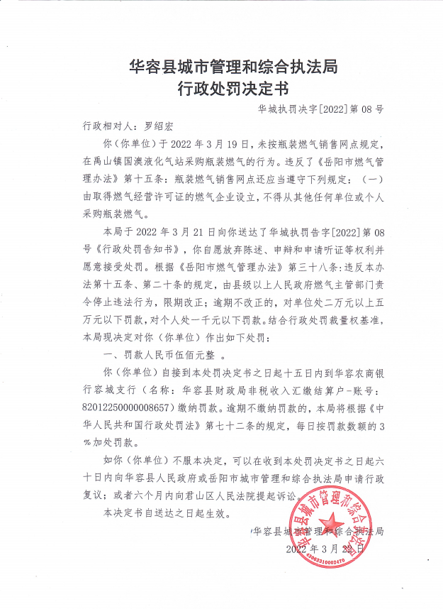 华容县燃气经营者未在禹山镇国澳液化气站未按瓶装燃气销售网点规定采购瓶装燃气的行政处罚决定公示