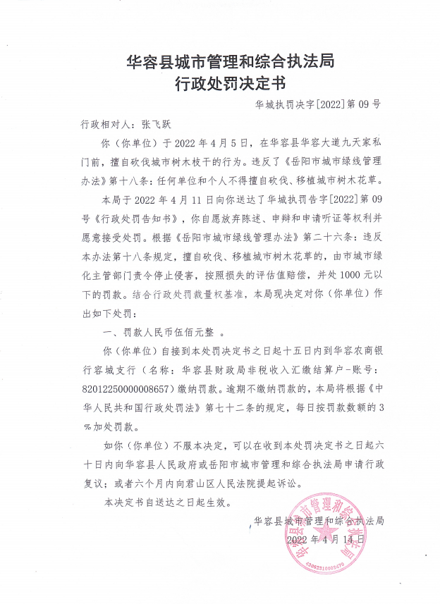 华容县华容大道九天家私门前擅自砍伐城市树木枝干的行政处罚决定公示