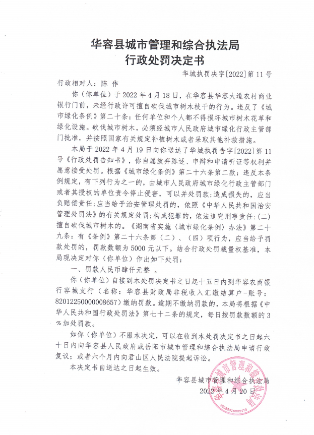 华容县华容大道农村商业银行门前,未经行政许可擅自砍伐城市树木枝干的行政处罚决定公示