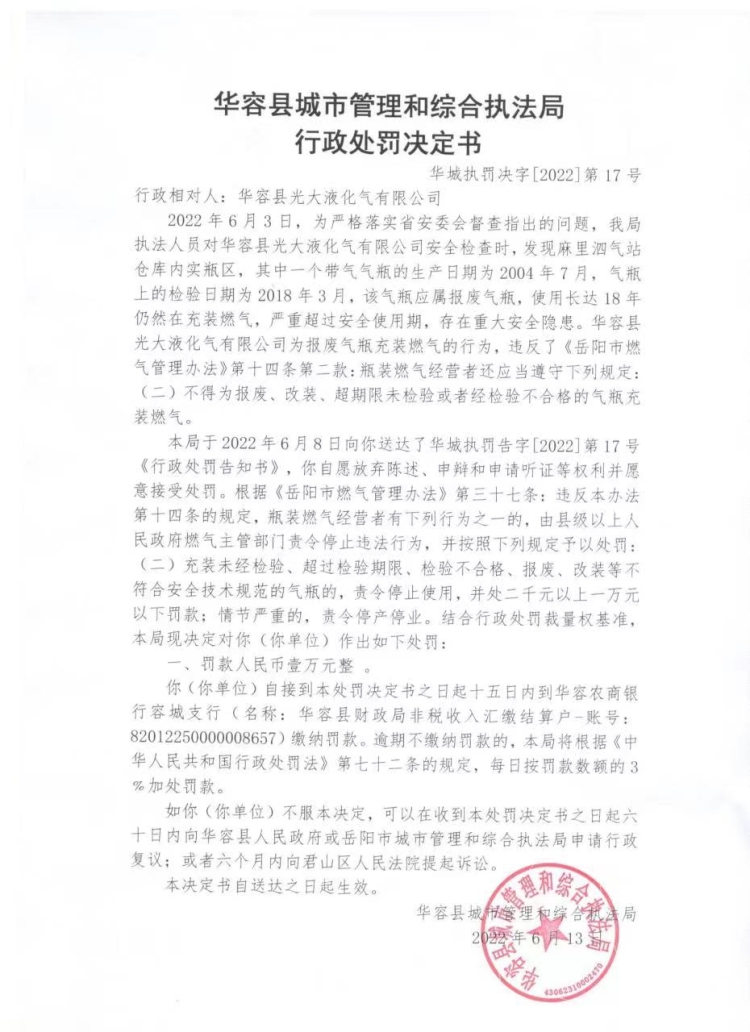 华容县光大液化气有限公司麻里泗气站使用报废气瓶的行政处罚决定公示