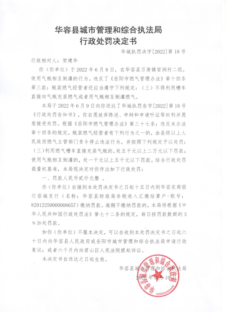 华容县万瘐镇官洲村二组燃气经营者使用气瓶相互倒灌的行政处罚决定公示