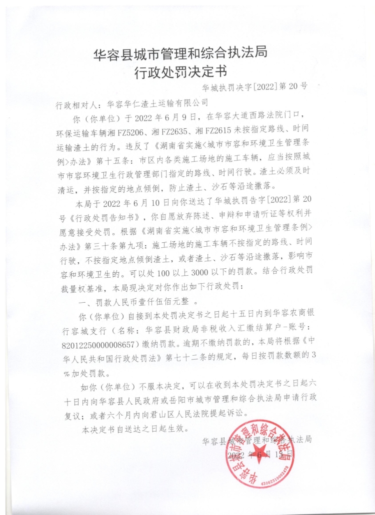 华容县华仁渣土运输有限公司环保运输车未按指定路线、时间运输渣土的行政处罚决定公示