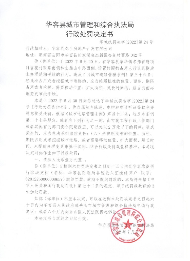 华容县春生房地产开发有限公司设置围挡占用人行道到期后未办理延期手续的行政处罚决定公示
