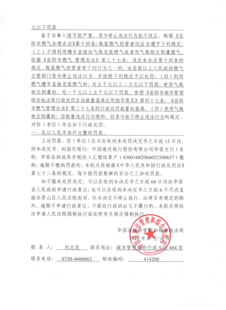 华容县新河乡华丰村一组燃气经营者用气瓶相互倒灌燃气的行政处罚决定公示
