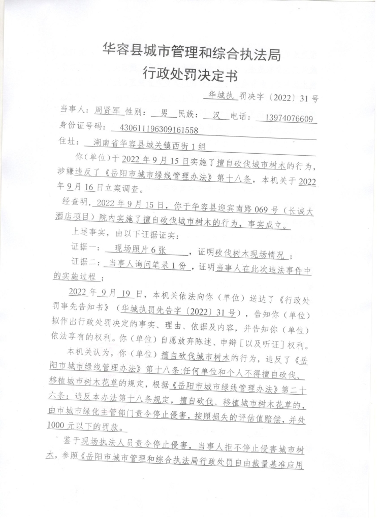 华容县城关镇西街擅自砍伐树木的行政处罚决定公示