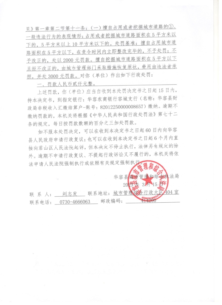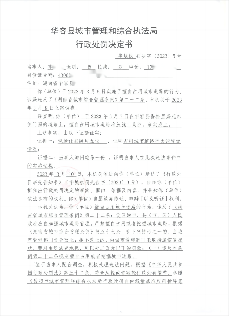 (华城执罚决字[2023]5号)对华容县注滋口镇桥南村均南三组邓某擅自占用城市道路的行政处罚决定公示