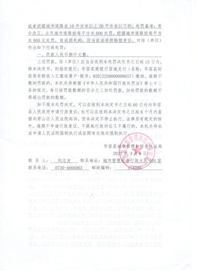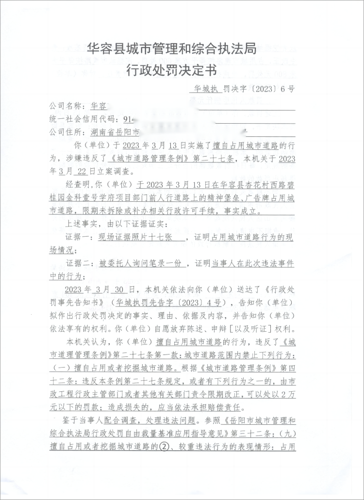 (华城执罚决字[2023]6号)对华容县章华镇茶花园路118号擅自占用城市道路的行政处罚决定公示