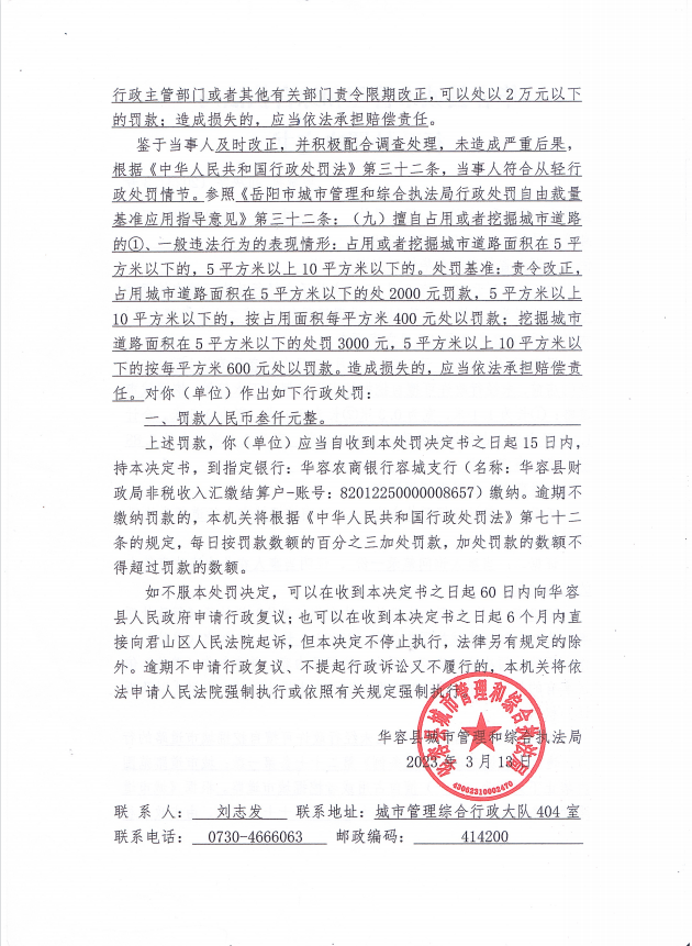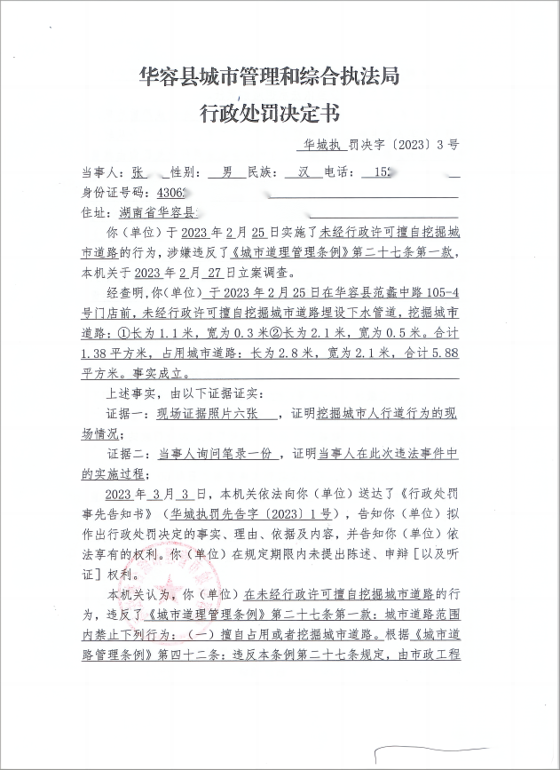 (华城执罚决字[2023]3号)对华容县章华镇田家湖村5组张某擅自挖掘城市道路的行政处罚决定公示