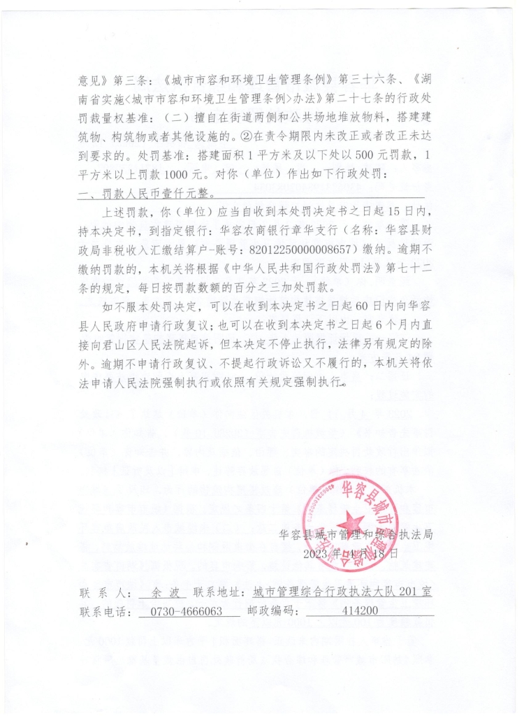 (华城执罚决字[2023]12号)对华容县北门市场重庆烤活鱼门店后擅自搭建构筑物的行政处罚决定公示