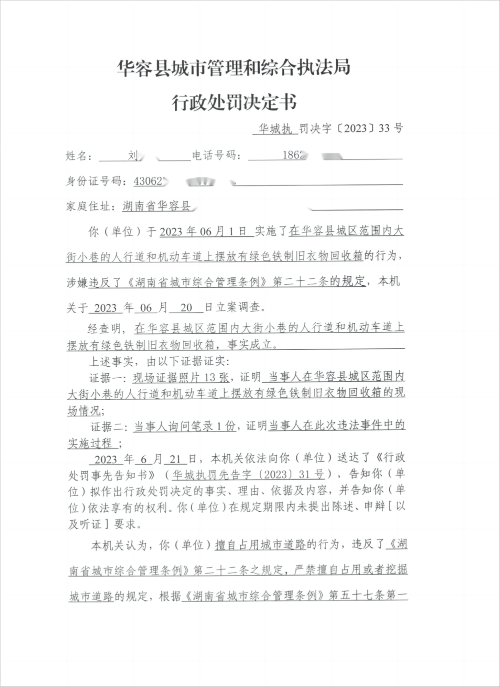 (华城执罚决字[2023]33号)对华容县万庾镇刘某违反湖南省城市综合管理条例的行政处罚决定公示
