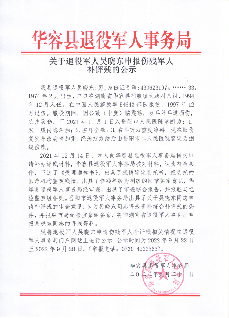 关于退役军人吴晓东申报伤残军人补评残的公示