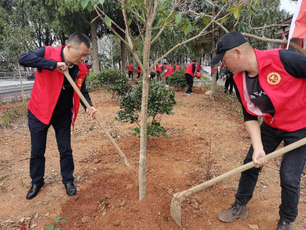 放下打扫工具,扛起铁锹和锄头,在明碧山革命烈士纪念地,华容县退役军人事务局党组书记、局长罗斌带头挥锹铲土、培土围堰、提水浇灌......现场呈现一片配合默契、热火朝天的繁忙景象。经过众人的辛勤劳作,新种植下的百来颗树苗挺拔在和煦的春风中。明媚的阳光下,这抹绿意与革命烈士纪念碑遥相呼应,好似诉说着它们必将如革命烈士精神一样,在这片红土地茁壮成长。
