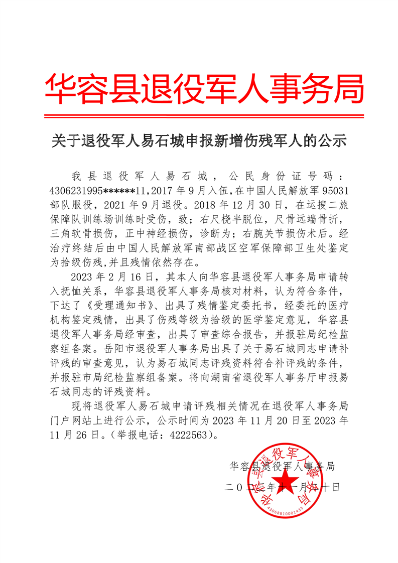 关于退役军人易石城申报新增伤残军人的公示