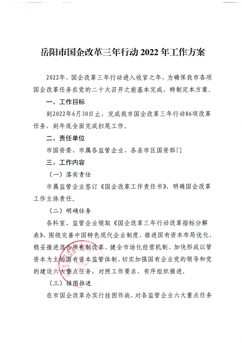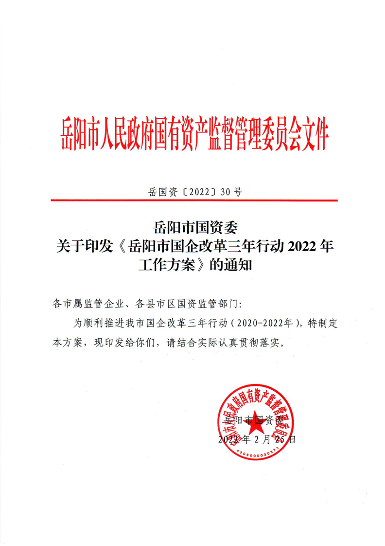 关于印发《岳阳市国企改革三年行动2022年工作方案》的通知