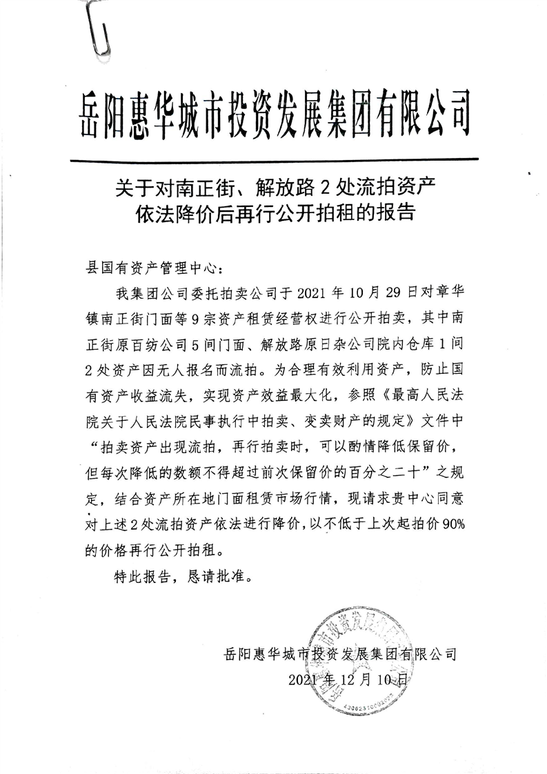 关于对南正街、解放路2处流拍资产依法降价后在行公开拍租的报告 2021.12.10