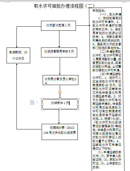 | 办理流程 | (一)受理:(1天)受理窗口:政务服务中心水利窗口;承办人:罗小军;盖《华容县水利局行政许可审批专用章》;资料传递人员:罗小军。 (二)审查:(6 天)负责单位:水资源管理局;承办人:姚汝智;签字:水资源管理局局长;盖《华容县水资源管理局》章。资料传递人员:姚汝智。 (三)决定:(2天)负责单位:县水利局;签字:分管局长;盖《华容县水利局》章。资料传递人员:姚汝智。 (四)办结告知:(1天)发证窗口:政务服务中心水利窗口;承办人:罗小军。 |