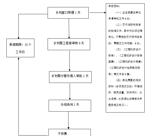 | 申请材料 | (一)业主或建设单位申请审批文件4份; (二)可行性研究报告的批准文件,其中对立项过程简化,不需报批可行研究报告的,需提交文件依据,4份; (三)《工程初步设计报告》、《工程初步设计报告图集》、《工程初步设计概算》《工程初步设计地质勘测报告》等文件各6套; (四)其他需要的相关资料(含项目涉及的:环境保护、移民安置、防洪评价、水土保持、水资源论证等有关专题报告及批文)。 |