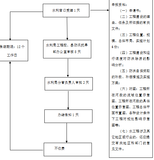 | 申请材料 | (一)申请书; (二)工程建设的理由、任务及所依据的有关文件; (三)工程位置、规模、总体布局、实施计划4份; (四)工程建设和运行调度对防洪除涝的影响分析; (五)防洪自保采取的补救、补偿措施及实施方案; (六)附图:工程所在河段的流域位置示意图、工程所在河段的具体位置示意图、工程总体平面布置图、各种设计条件下工程对规划影响示意图等; (七)水工程涉及其它地区或行业的,还应提交有关地区和部门的意见文件; |