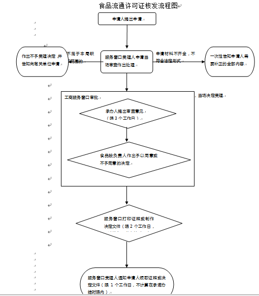 | 申请材料 | 以下所需表格可从窗口提供空白文本和示范文本,也可在岳阳红盾信息网www.yygs.com或从百度等搜索引擎直接搜索下载电子档,申请者按示范文本填写。 1、《食品流通许可申请书》; 2、《名称预先核准通知书》复印件; 3、与食品经营相适应的经营场所的使用证明; 4、负责人及食品安全管理人员的身份证明; 5、与食品经营相适应的经营设备、工具清单; 6、与食品经营相适应的经营设施空间布局和操作流程的文件; 7、食品安全管理制度文本; 8、省、自治区、直辖市工商行政管理局规定的其他材料。 |