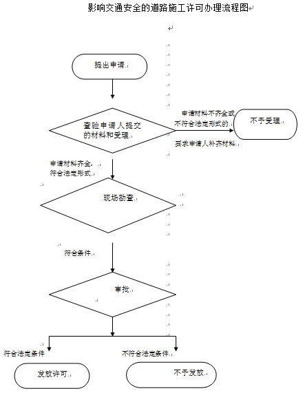 | 办理流程 | 此项行政审批包括由施工单位提出申请;经现场勘查,符合施工标准,报县交警大队审批。 |