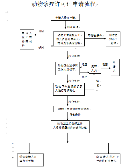 | 受理条件 | 1、有与动物诊疗活动相适应并符合动物防疫条件的场所。 2、有与动物诊疗活动相适应的执业兽医。 3、有与动物诊疗活动相适应的兽医器械和设备。 4、有完善的管理制度。 |