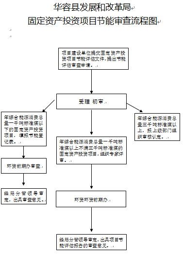 | 办理流程 | 1.受理:受理单位:华容县发展和改革局环资前期办;承办人:黎勇 2.评估和审查:承办人对评估申请审查作出处理,并对申报材料进行审核,签署审核意见。将材料呈局分管局长陈可良。 3.决定:通知申请人领取决定文件,盖《华容县发展和改革局节能审查专用章》 |