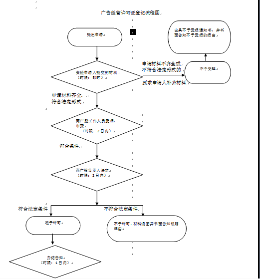 | 办理流程 | (一)申请与受理: (1)受理单位:工商局商标广告监督管理股;受理人:工商局商标广告监督管理股工作人员。 (2)岗位职责及权限: 对申请人提交的登记申请,根据下列情况分别作出是否受理的决定: 1、申请材料齐全、符合法定形式的,应当决定予以受理; 2、申请材料齐全并符合法定形式,但申请材料需要核实的,应当决定予以受理,同时书面告知申请人需要核实的事项,理由及时间; 3、申请材料存在可以当场更正的错误的,应当允许有权更正人当场予以更正,由更正人在更正处签名或者盖章、注明更正日期;经确认申请材料齐全,符合法定形式的,应当决定予以受理; 4、申请材料不齐全或者不符合法定形式的,应当当场或者在五日内一次告知申请人需要补正的全部内容。告知时,将申请材料退回申请人并决定不予受理。属于五日内告知的,应当收取材料并出具收到材料凭据; 5、不属于登记范畴或者不属于本机关登记管辖范围的事项,应当即时决定不予受理,并告知申请人向有关行政机关申请。 通过邮寄、传真、电子数据交换、电子邮件等方式提交申请的,应当自收到申请之日五日内作出是否受理的决定。 (二)审查与决定: (1)岗位责任人:工商局商标广告管理股负责人。 (2)岗位职责及权限: 广告监督管理机关自受理之日起5日内,作出是否予以批准的决定。批准的,颁发《广告经营许可证》;不予批准的,书面说明理由。 |