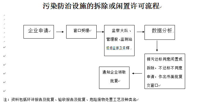 | 申请材料 | 1、污染防治设施闲置与拆除申请报告1份(纸质档); 2、企业监测报告 1份(纸质档); 3、环境行政主管部门调查报告 1 份 (纸质档); 4、污染防治设施相关资料 1份(纸质档)。 |