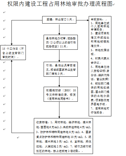 | 办理流程 | 1、受理:(1天)受理单位:政务服务中心林业窗口;承办人:吴晓华;资料传递人员:李隆发。 2、县局林地办初审、勘测(2公顷以上的由市局现场核实)(11天):负责单位:林业局林地办;承办人:胡尔斌等人;签字:林政股分管负责人易旭辉;盖华容县林业局行政章;资料传递人员:陈明。 3、市局、县局出具审核意见(3天),报省或国家林业主管部门审批。 |