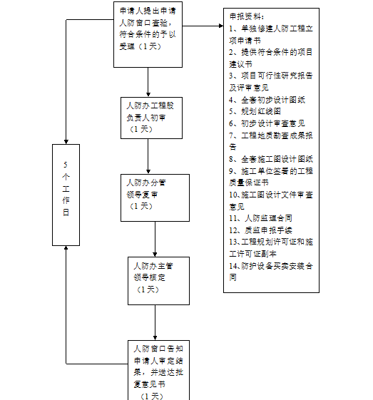 | 申请材料 | 1、单独修建人防工程立项申请书 2、提供符合条件的项目建议书 3、项目可行性研究报告及评审意见 4、全套初步设计图纸 5、规划红线图 6、初步设计审查意见 7、工程地质勘查成果报告 8、全套施工图设计图纸 9、施工单位签署的工程质量保证书 10、施工图设计文件审查意见 11、人防监理合同 12、质监申报手续 13、工程规划许可证和施工许可证副本 14、防护设备买卖安装合同 (份数:1份) |