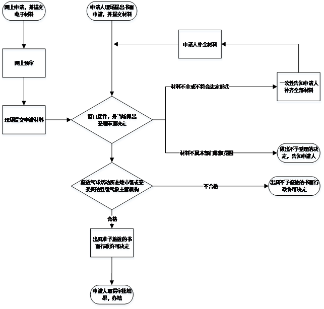 | 受理条件 | (一)申请条件 1.具有施放气球资质证; 2.施放无人驾驶自由气球至少提前5天申请; 3.施放系留气球至少提前3天申请; 4.施放气球符合法律法规规定的安全要求。 (二)同时具备或符合如下条件的,准予批准: 1.申请事项属于本行政机关职权范围; 2.申请人具备相应申请条件; 3.申请材料真实、完整,符合法定形式; 4.施放环境、施放期间的气象条件符合施放要求。 (三)有如下情形之一的,不予批准: 1.申请事项不属于本行政机关职权范围; 2.申请人不具备相应申请条件; 3.申请材料不真实、不完整,不符合法定形式; 4. 施放环境、施放期间的气象条件不符合施放要求。 |