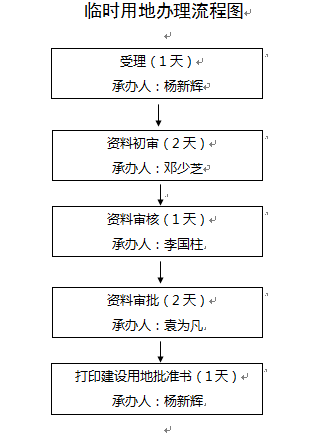 | 办理流程 | 1、受理:(1天)受理单位:窗口受理;承办人:杨新辉; 2、资料初审:(1天)承办人:用地股股长邓少芝; 3、资料审核:(1天)承办人:李国柱; 4、资料审批:(2天)承办人:袁为凡; 5、打印临时用地审批单:(1天)承办人:杨新辉。 |