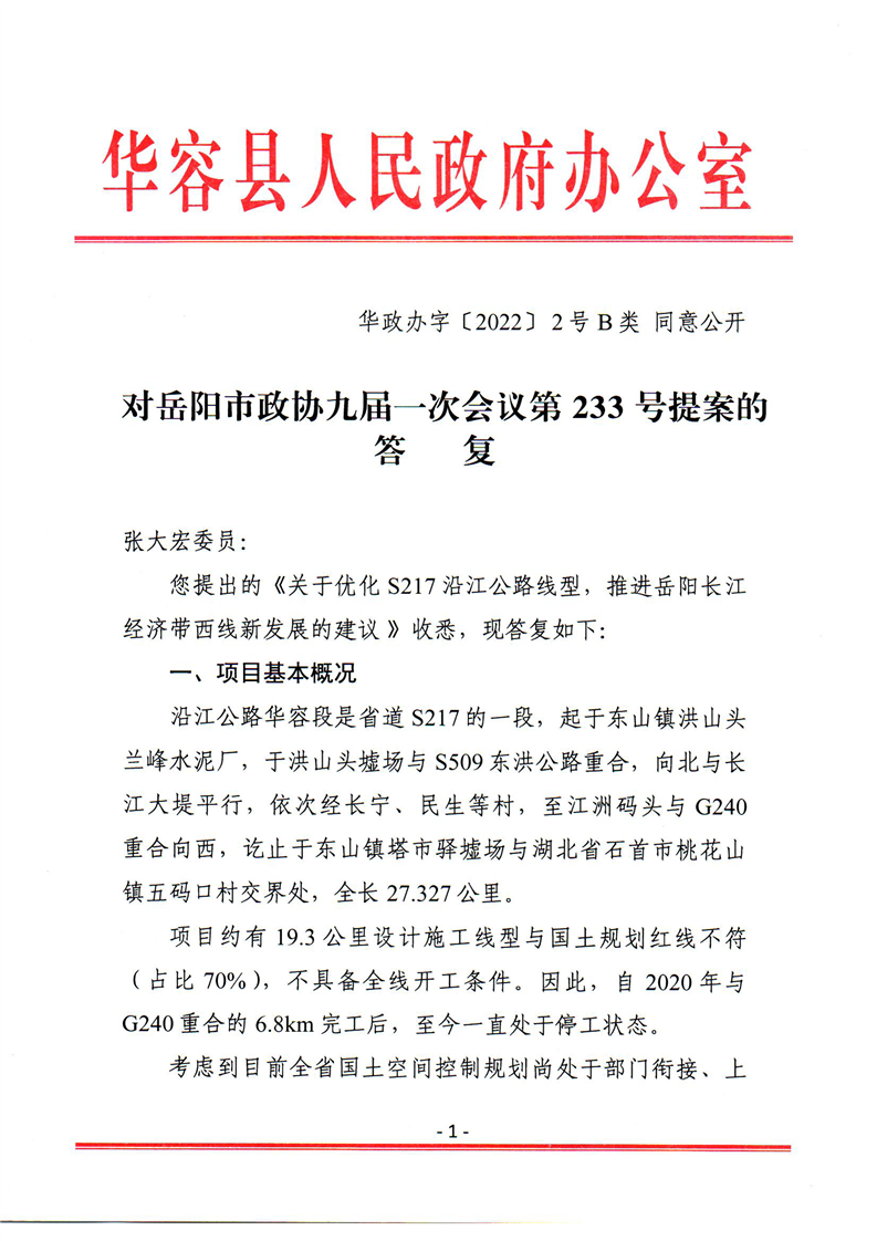 对岳阳市政协九届一次会议第233号提案的答复