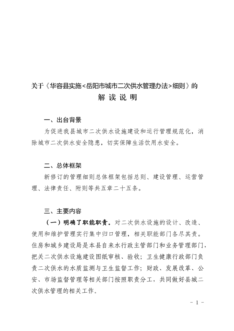 【部门解读】关于《华容县实施岳阳市城市二次供水管理办法细则》的解读说明
