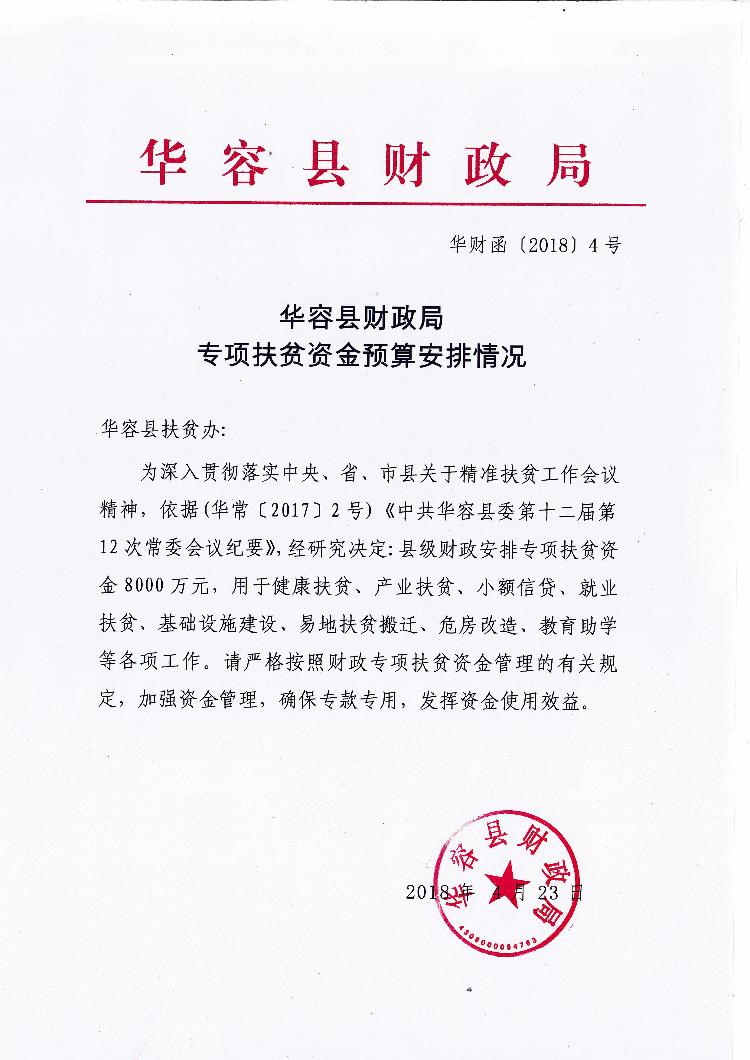 为深入贯彻落实中央、省、市县关于精准扶贫工作会议精神,依据(华常〔2017〕2号)《中共华容县委第十二届第12次常委会议纪要》,经研究决定:县级财政安排专项扶贫资金8000万元用于健康扶贫、产业扶贫、小额信贷、就业扶贫、基础设施建设、易地扶贫搬迁、危房改造、教育助学等各项工作。