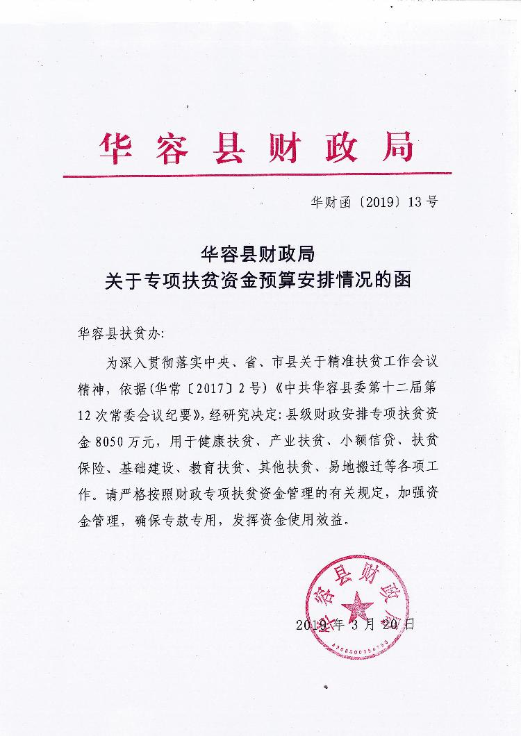 为深入贯彻落实中央、省、市县关于精准扶贫工作会议精神,依据(华常〔2017〕2号)《中共华容县委第十二届第12次常委会议纪要》,经研究决定:县级财政安排专项扶贫资金8050万元,用于健康扶贫、产业扶贫、小额信贷、扶贫保险、基础建设、教育扶贫、其他扶贫、易地搬迁等各项工作。