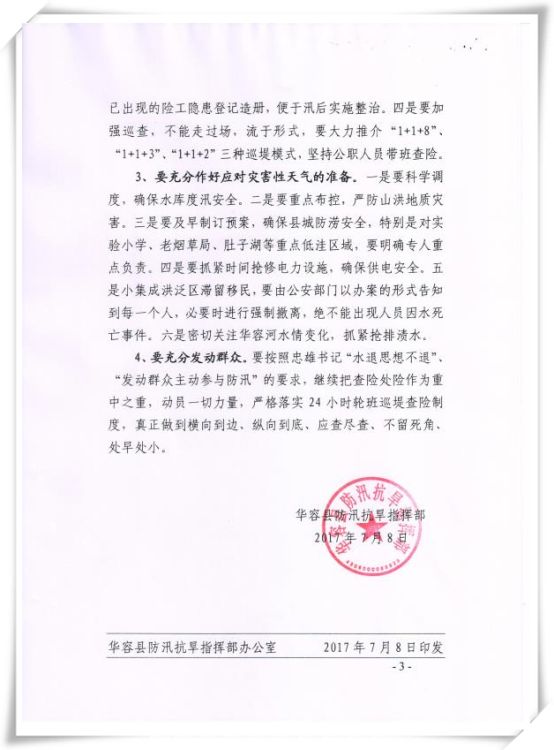 3、要充分作好应对灾害性天气的准备。一是要科学调度,确保水库度汛安全。二是要重点布控,严防山洪地质灾害。三是要及早制订预案,确保县城防涝安全,特别是对实验小学、老烟草局、肚子湖等重点低洼区域,要明确专人重点负责。四是要抓紧时间抢修电力设施,确保供电安全。五是小集成洪泛区滞留移民,要由公安部门以办案的形式告知到每一个人,必要时进行强制撤离,绝不能出现人员因水死亡事件。六是密切关注华容河水情变化,抓紧抢排渍水。