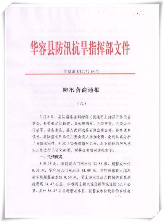 8日18时,洞庭湖六门闸水位33.86米,超警戒水位0.36米;华容河六门闸水位34.09米,华容河东新太垸及新华垸超警戒水位0.59米。受上述水位站点控制的我县洞庭湖堤34.47公里、华容河东新太垸及新华垸堤防52.4公里,共计86.87公里超警戒水位。按警戒水位设防的乡镇有团洲、注滋口、三封寺、章华(河东)、治河渡。藕池河下游罗家嘴至出口段、华容河东人民垸、河西护城垸共74.38公里一线防洪大堤按防守准备水位设防。