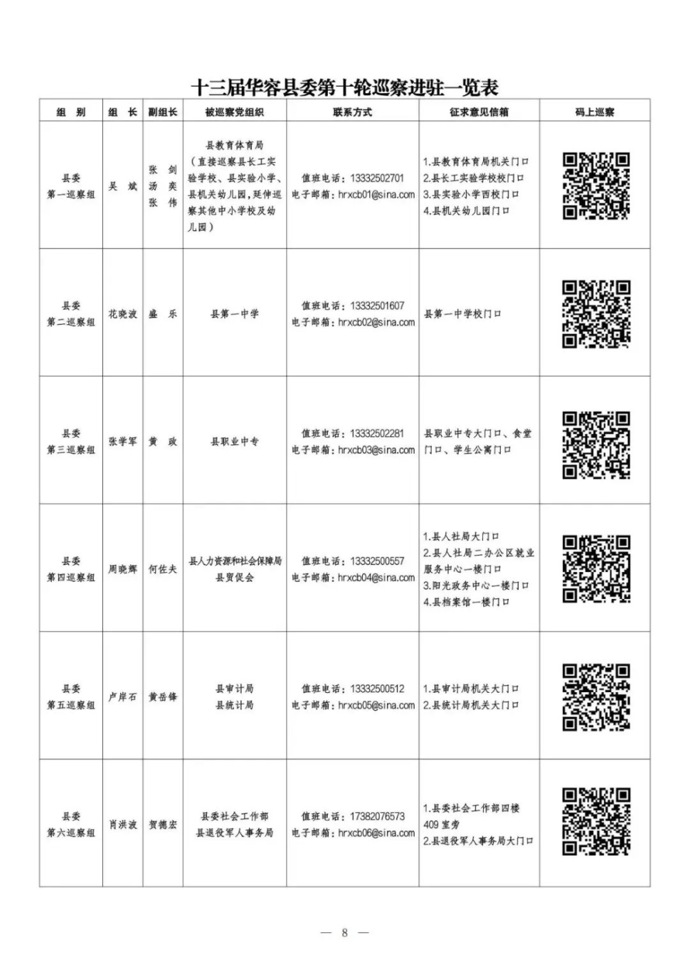 十三届华容县委第十轮巡察进驻一览表