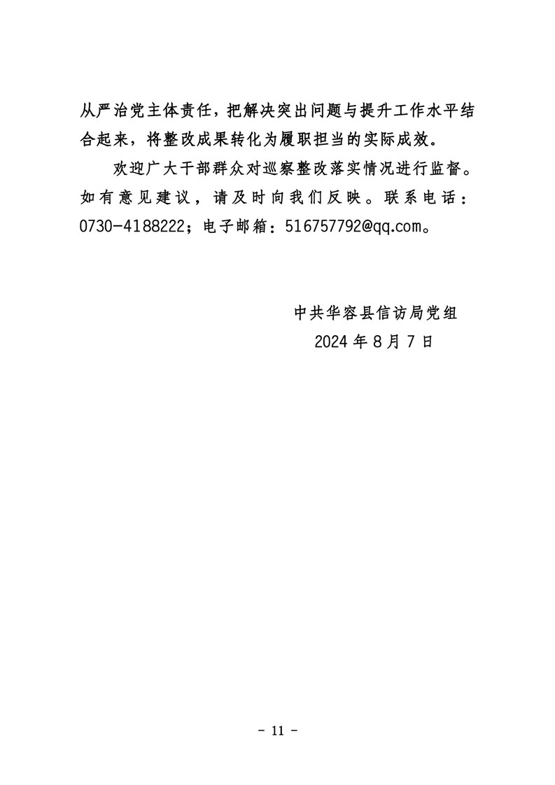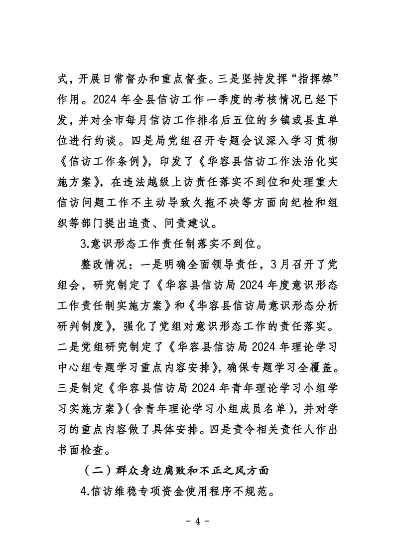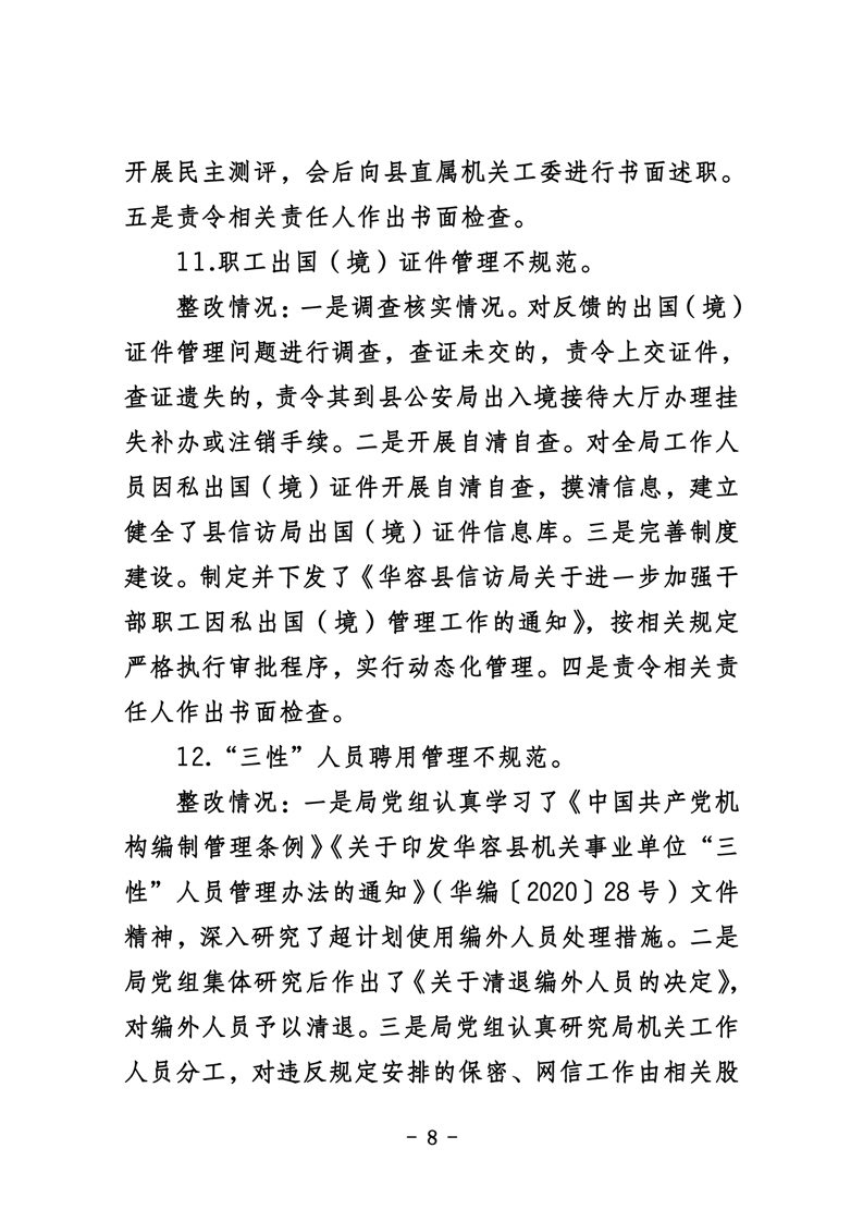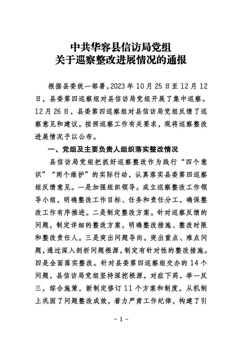 中共华容县信访局党组关于巡察整改进展情况的通报