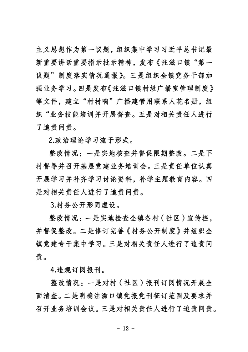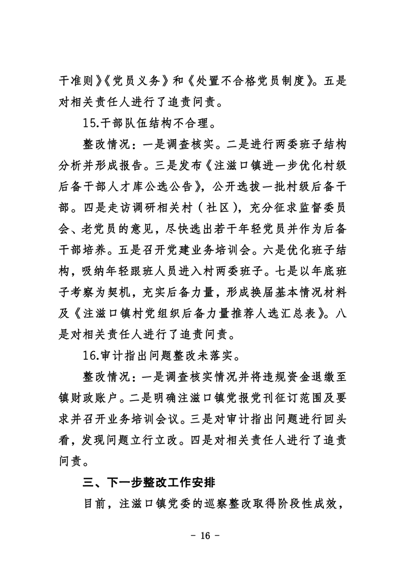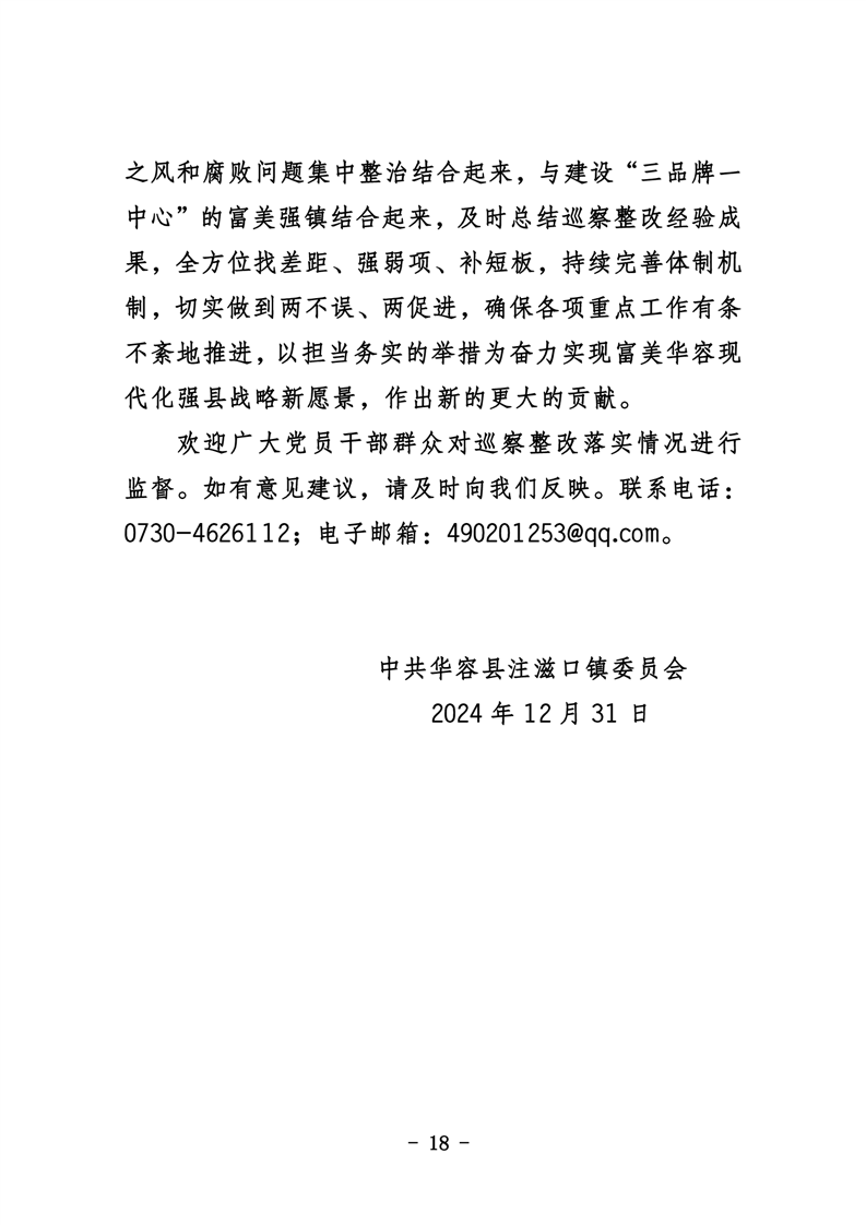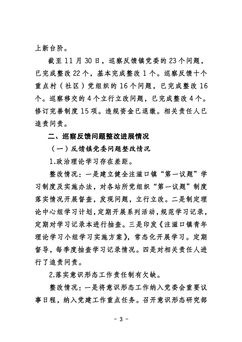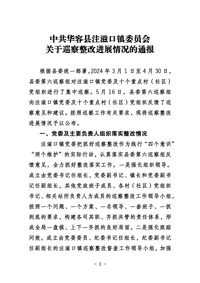 中共华容县注滋口镇委员会关于巡察整改进展情况的通报