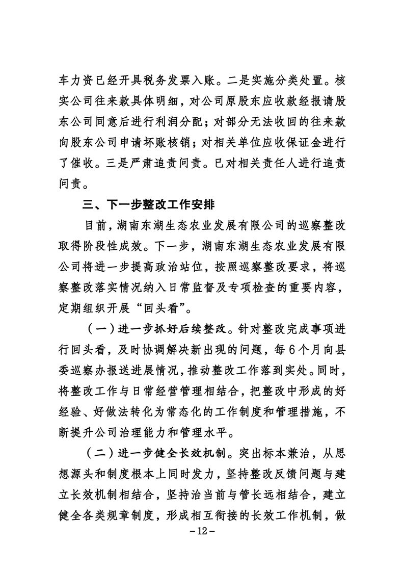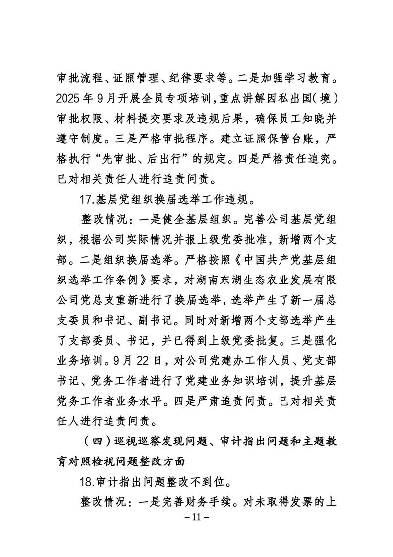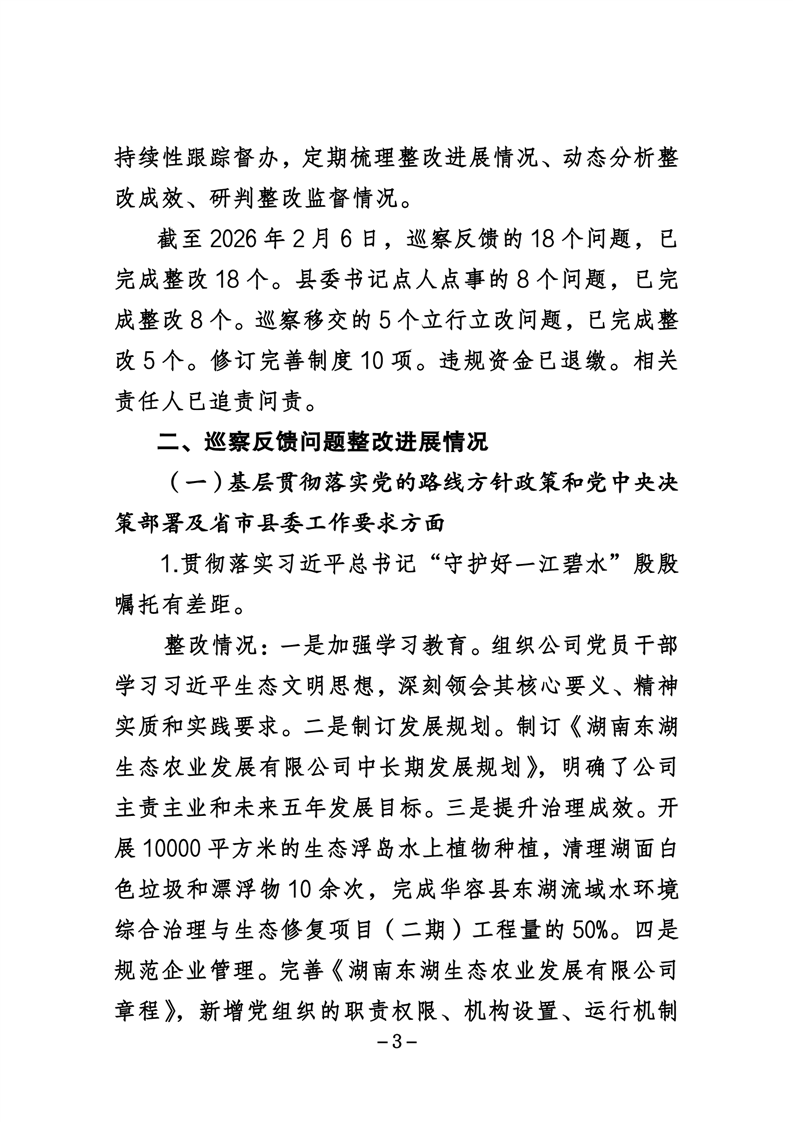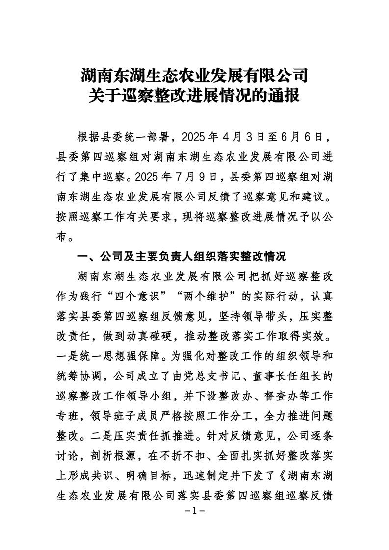 湖南东湖生态农业发展有限公司关于巡察整改进展情况的通报
