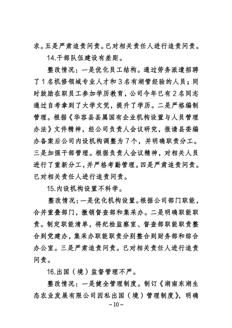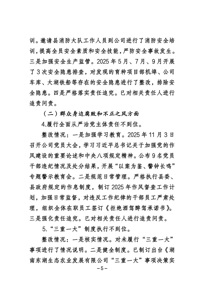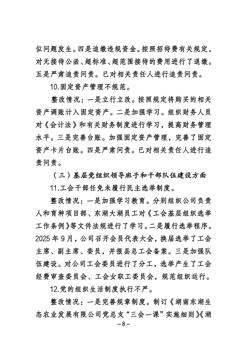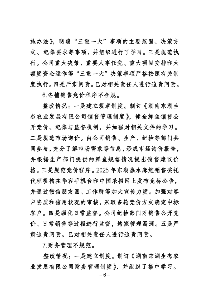 湖南东湖生态农业发展有限公司关于巡察整改进展情况的通报