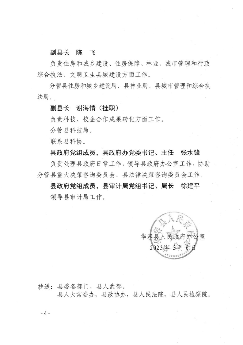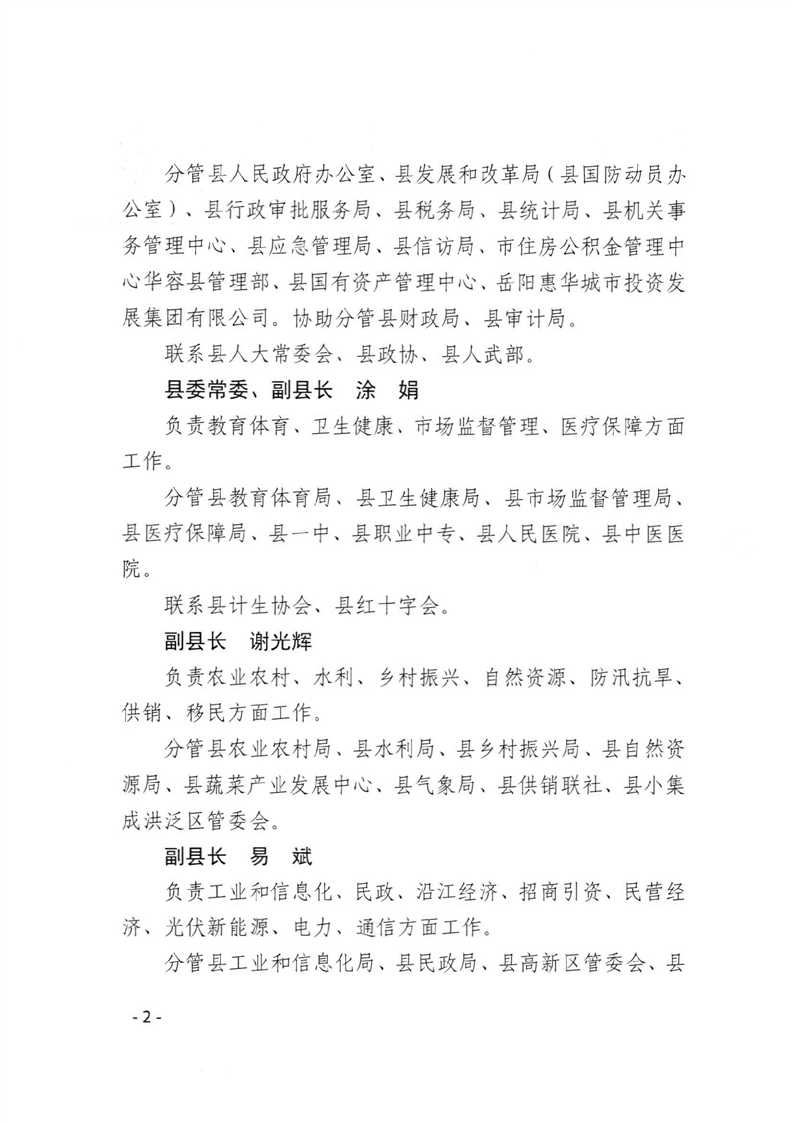 华容县人民政府办公室 关于调整华容县人民政府领导班子成员工作分工的通知