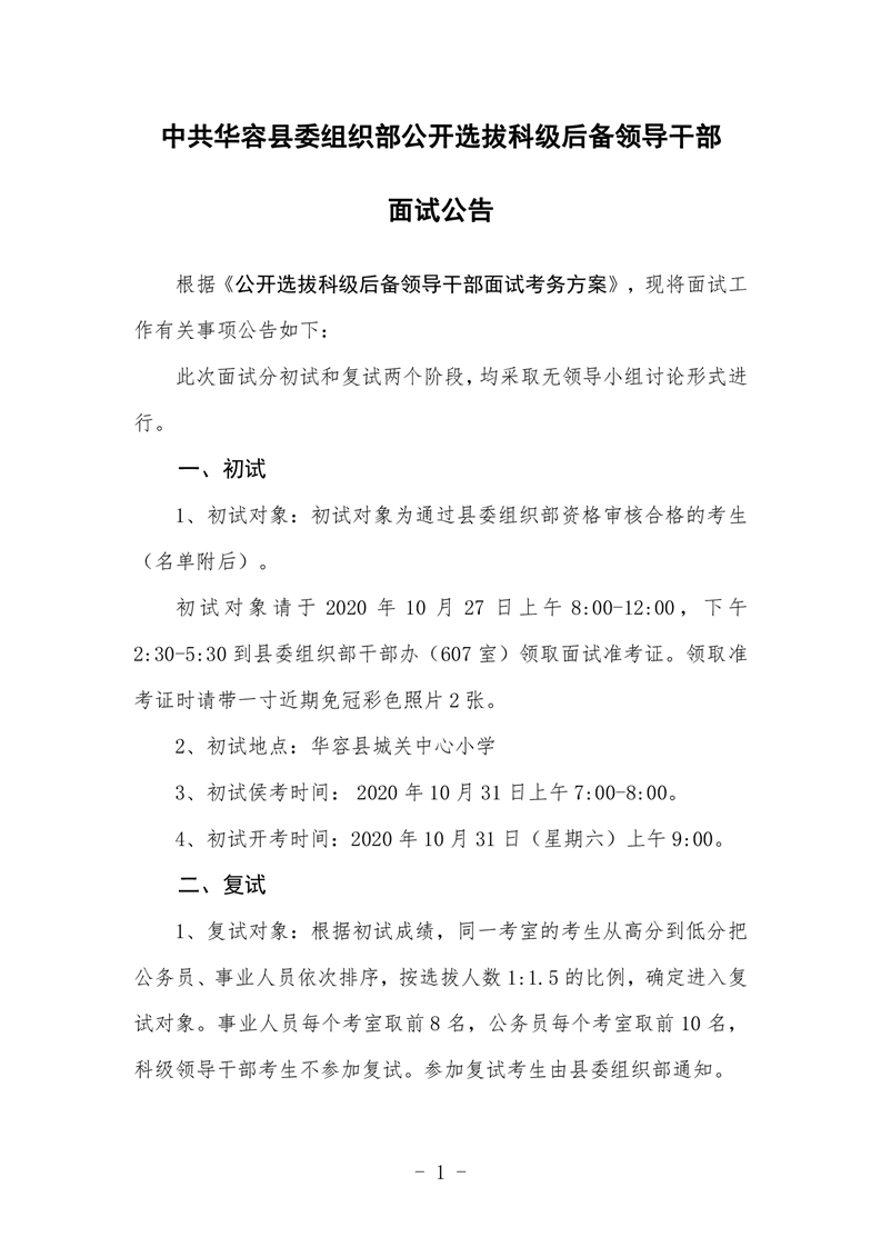中共华容县委组织部公开选拔科级后备领导干部面试公告
