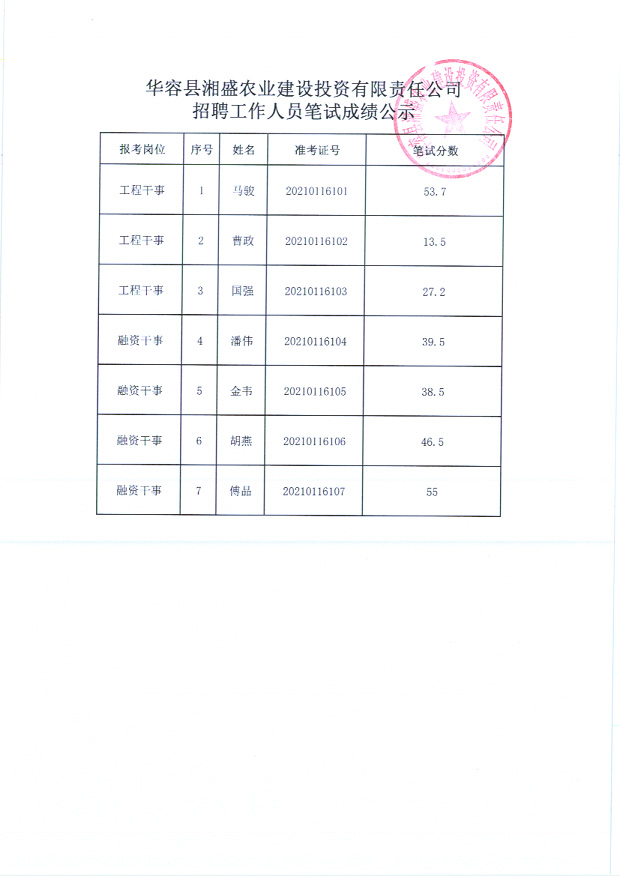 华容县湘盛农业建设投资有限责任公司招聘工作人员笔试成绩公示