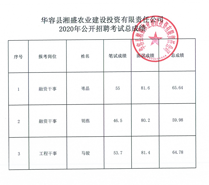 华容县湘盛农业建设投资有限责任公司2020年公开招聘考试总成绩公示