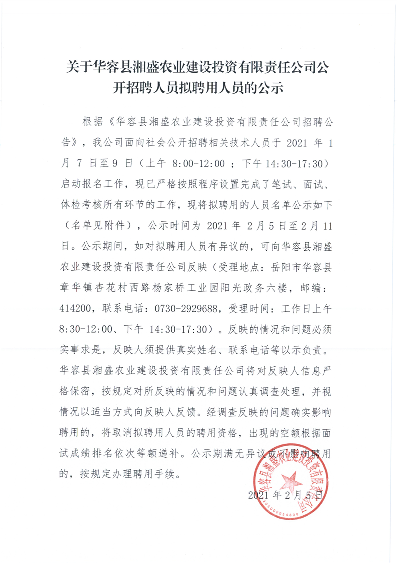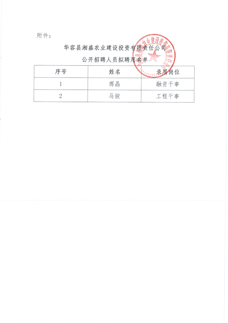 华容县湘盛农业建设投资有限责任公司2020年公开招聘拟聘用人员公示